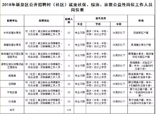 10日,颍泉区发布了招聘村(社区)就业社保、综治、宗教公益性岗位人员124人公告,符合条件的35周岁以下、高中及以上学历人员皆可报名。