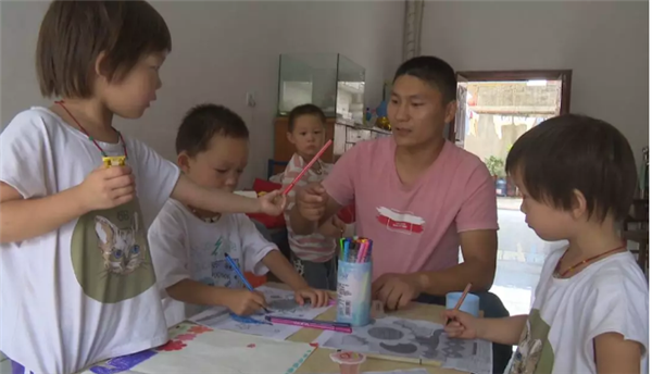 如今,四胞胎“吉、祥、茹、艺”已经上学前班。放学后,张伟搬出桌子,铺开画纸,拿出画笔,四胞胎放下书包,围坐在一起,开始画画。