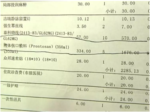 缝合伤口时,朱先生对医生说:怎么简单怎么处理,用药怎么便宜怎么处理。可让他没想到的是,仅消毒水一项就花了1670元,345元/瓶的消毒水用了5瓶。朱先生说,当时他一再地跟医生说,意外伤害新农合报销比例低,他这是皮外伤,不想用太好的药物,但是就这还花销了4000多元,他认为医药费太高,接受不了。