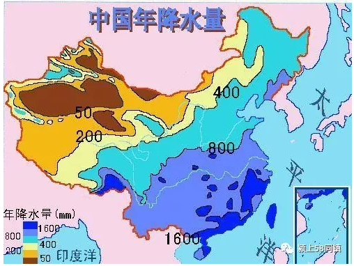 这是我国年降水量图,可以看到标着800的那一条就是800mm等降水量线。对于我国来说,降水主要受来自海洋的暖湿气流影响,也就是夏季风,所以我国降水普遍集中在夏季而且东部沿海地区季风气候明显。