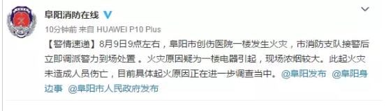 8月9日9点左右,阜阳市创伤医院一楼发生火灾,市消防支队接警后立即调派警力到场处置 。火灾原因疑为一楼电器引起,现场浓烟较大。此起火灾未造成人员伤亡,目前具体起火原因正在进一步调查当中。火灾原因疑为一