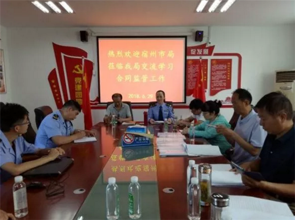 为加强合同监管工作,加大合同违法案件的查处力度, 6月29日市局合同科及各县区合同工作负责人一行7人,赴阜阳市工商局考察学习合同案件查处工作经验。到了阜阳市工商局,不顾舟车劳顿,即刻听取了阜阳市局合同