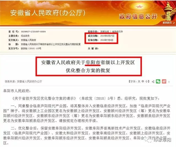 省政府最新批复7月4日,安徽省人民政府网站公布了《安徽省人民政府关于阜阳市省级以上开发区优化整合方案的批复》、《安徽省人民政府关于六安市省级以上开发区优化整合方案的批复》。此次省政府批复阜阳省级以上开